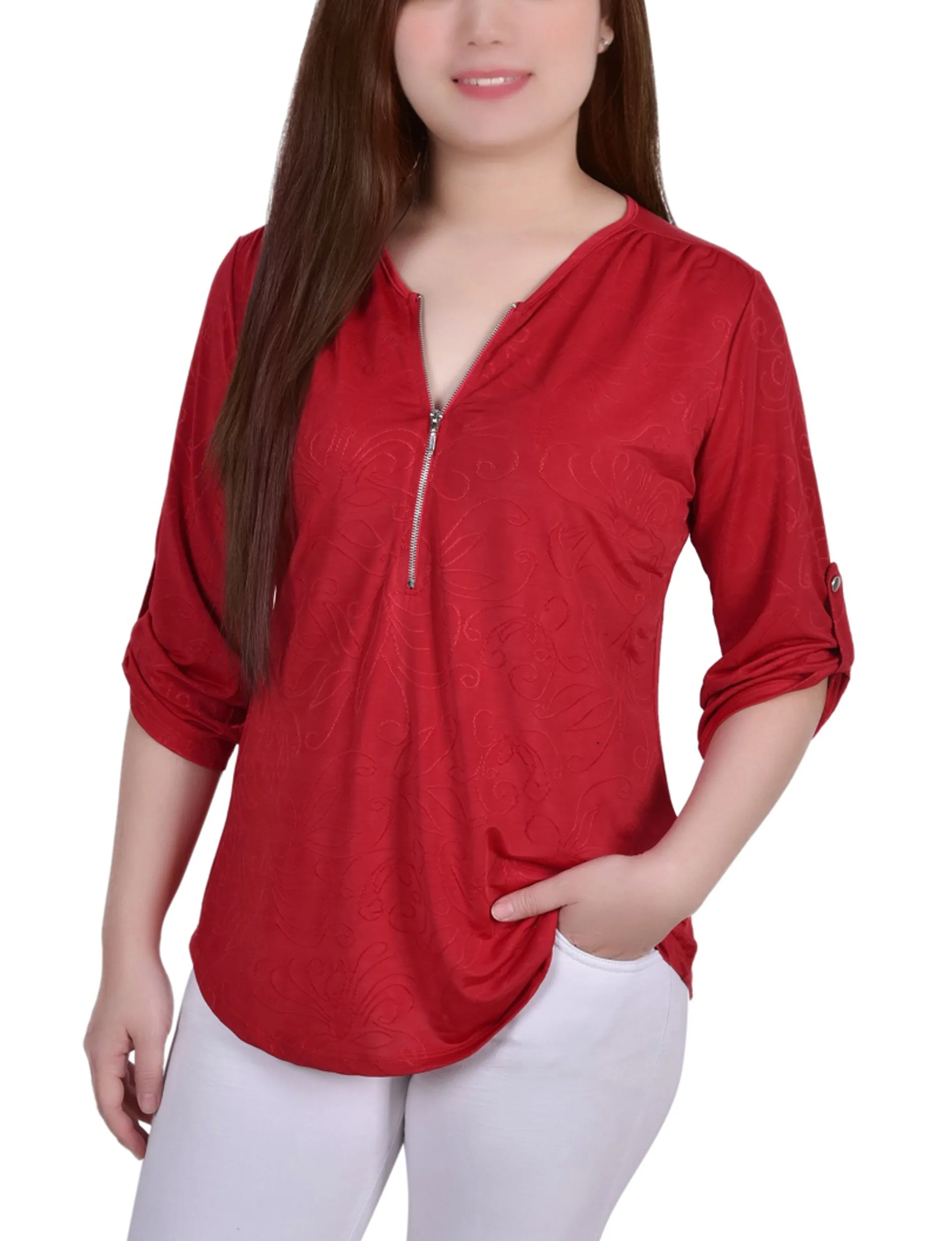 Dress it up or down. This NY Collection zip front knit jacquard blouse can be worn to the office or while out with friends.