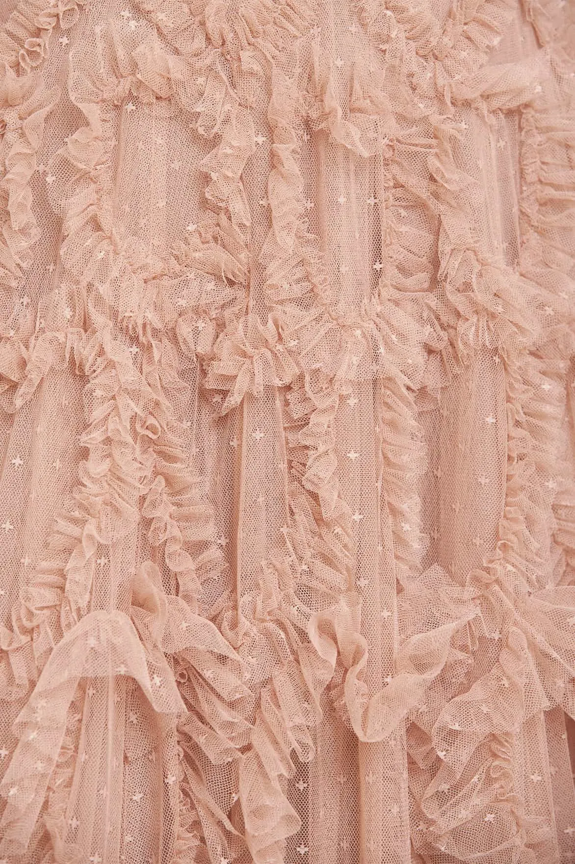 The Amorette V-Neck Gown in Sand. A signature Needle & Thread style; beautifully adorned with our key love heart motif, made from gently gathered delicate tulle. Designed with romantic, frothy sleeves created using layers of delicate tulle and frills for a statement look. Featuring a generously voluminous skirt layered with tulle and net for a full, magical silhouette. A textile piece you'll forever treasure.- Kisses tulle decorated with layers of tulle ruffles