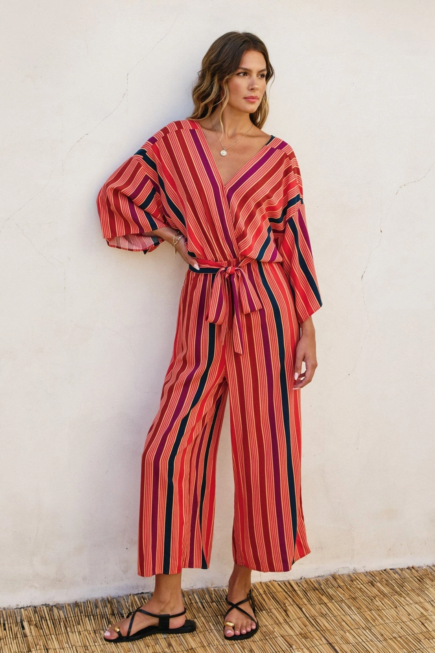 STRIPED KIMONO SURPLICE JUMPSUIT A STRIPED ONE-AND-DONE LOOK WITH KIMONO SLEEVES AND A CINCHED WAIST