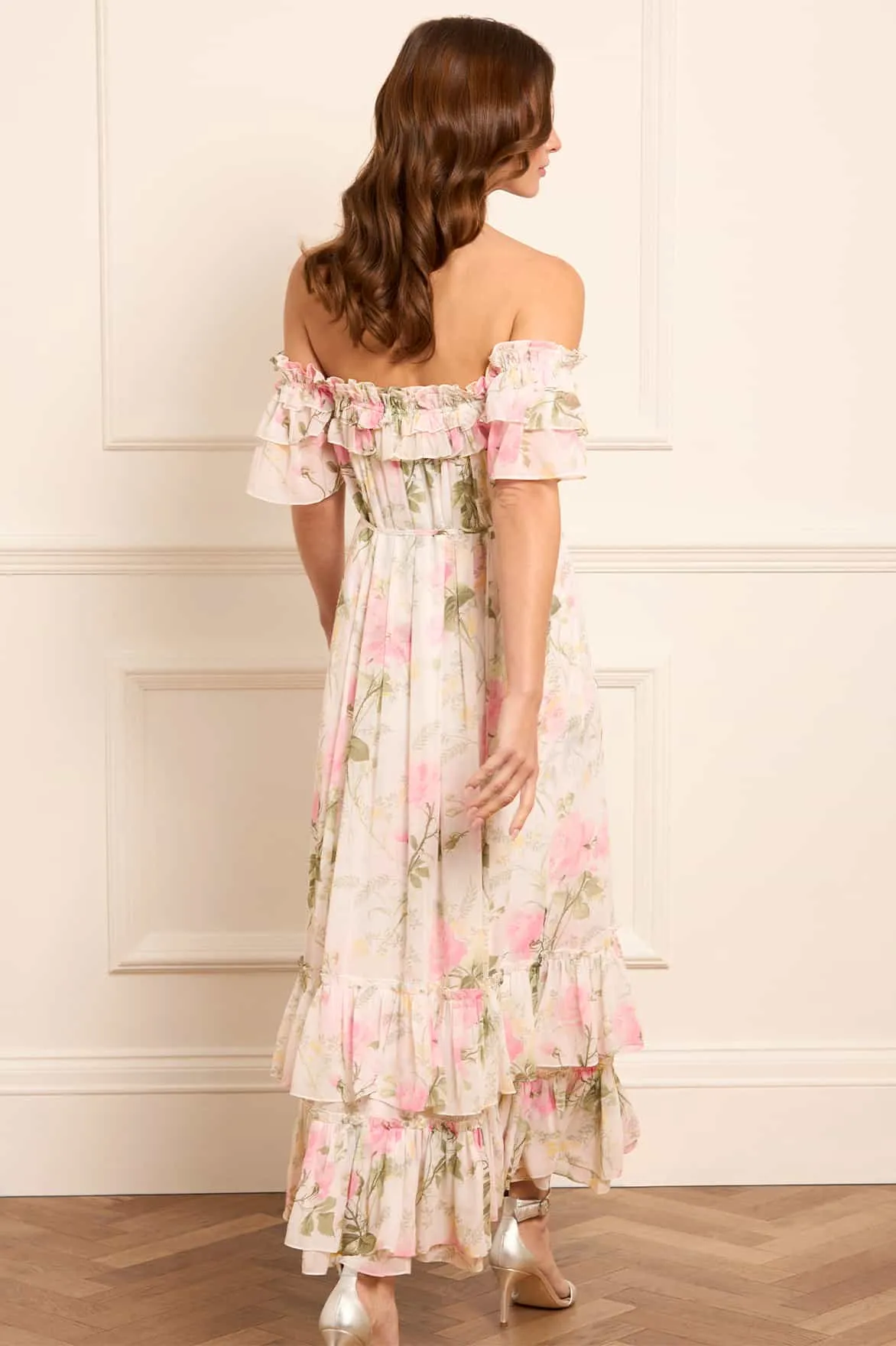 The Rose Chiffon Off-Shoulder Ankle Gown in Moonshine/Pink features a romantic print inspired by antique hand-painted artwork, with large rose blooms and trailing florals. Made from soft semi-sheer chiffon, this easy-fit, fully lined gown is cinched at the waist with a self-fabric belt for added versatility. Developed with gently gathered frill tiers enhance the romantic styling, while frothy chiffon ruffles adorn the off-shoulder neckline and a short fluted sleeve completes the look.
