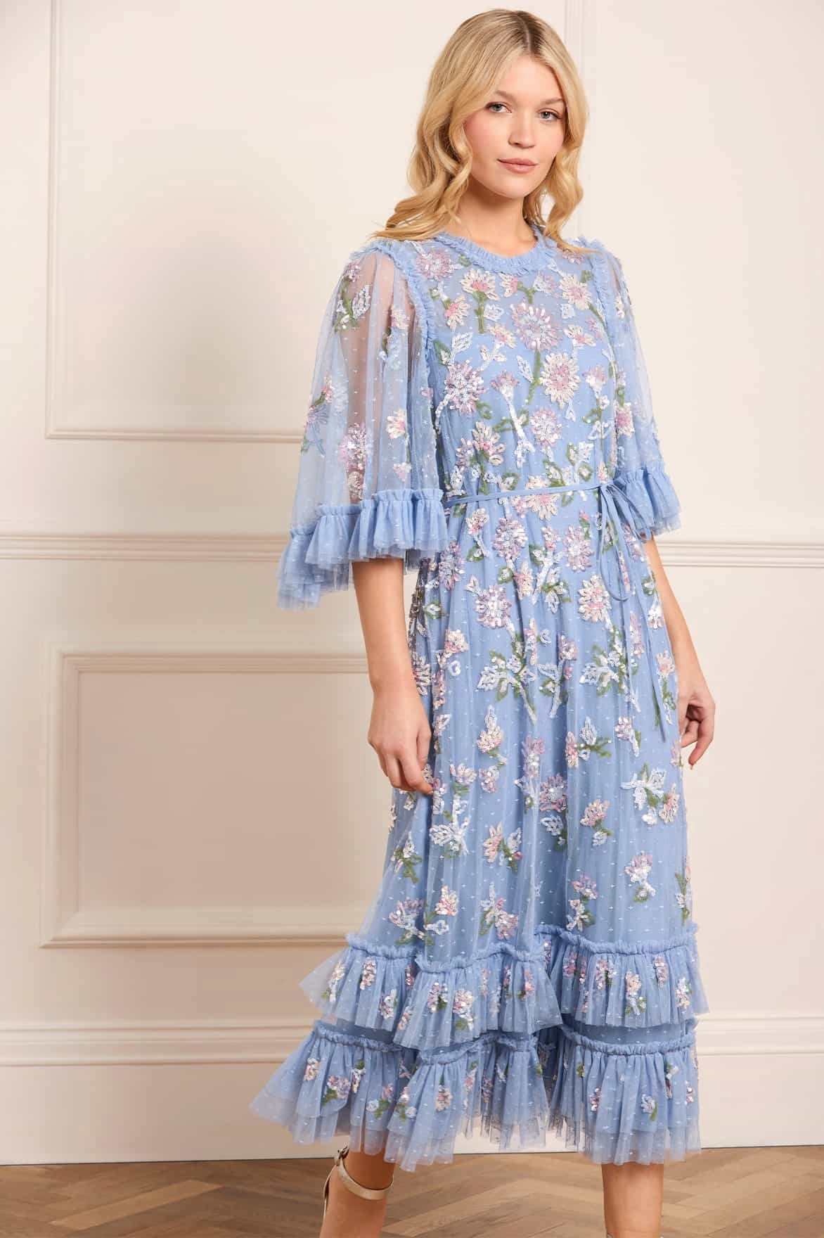 The Sequin Dandelion Gloss Ballerina Dress in Sky Blue is inspired by Victorian botanical artist Marianne North. This dress features shimmering dandelion floral sequins that delicately scatter towards the hem, creating a radiant effect. The sequins have a high-shine gloss finish, enhanced by a foil coating. With a loose, floaty silhouette and voluminous sleeves, this romantic dress is perfect for any special occasion.