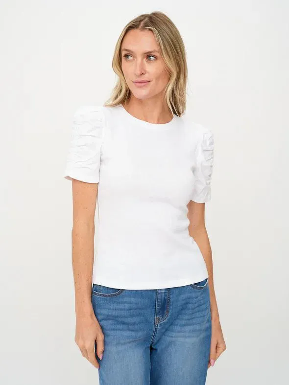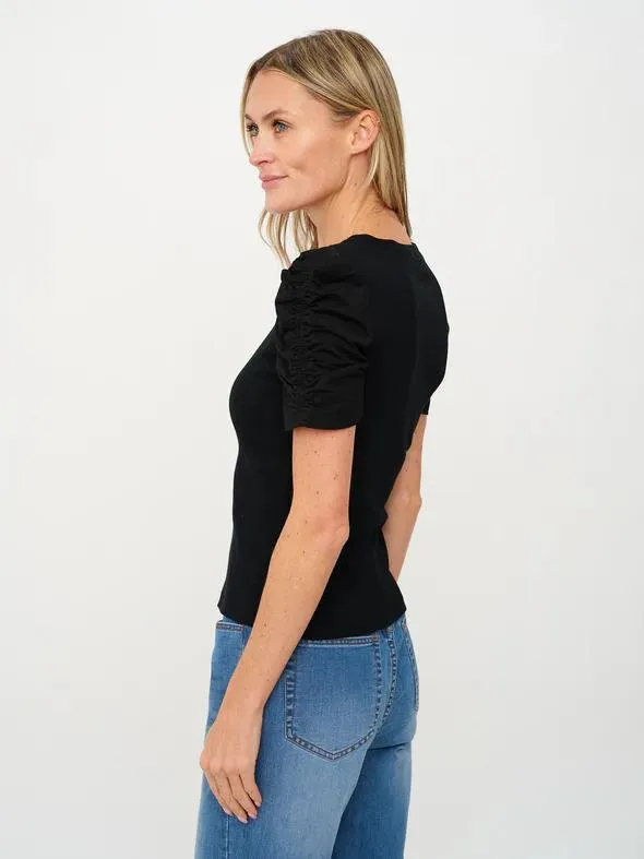 Six Fifty Ribbed Ruched Sleeve TopThe Six Fifty Ribbed Ruched Sleeve Top is an easy choice for days when you want something simple with just enough detail. Made from a soft, stretchy ribbed knit that holds its shape, it feels polished without being stiff or fussy. The subtle ruching on the sleeves adds interest while staying understated, so it pairs effortlessly with denim, tailored pants, or skirts. Designed for a flattering, comfortable fit you can wear all day. A versatile staple youll reach for again and again.