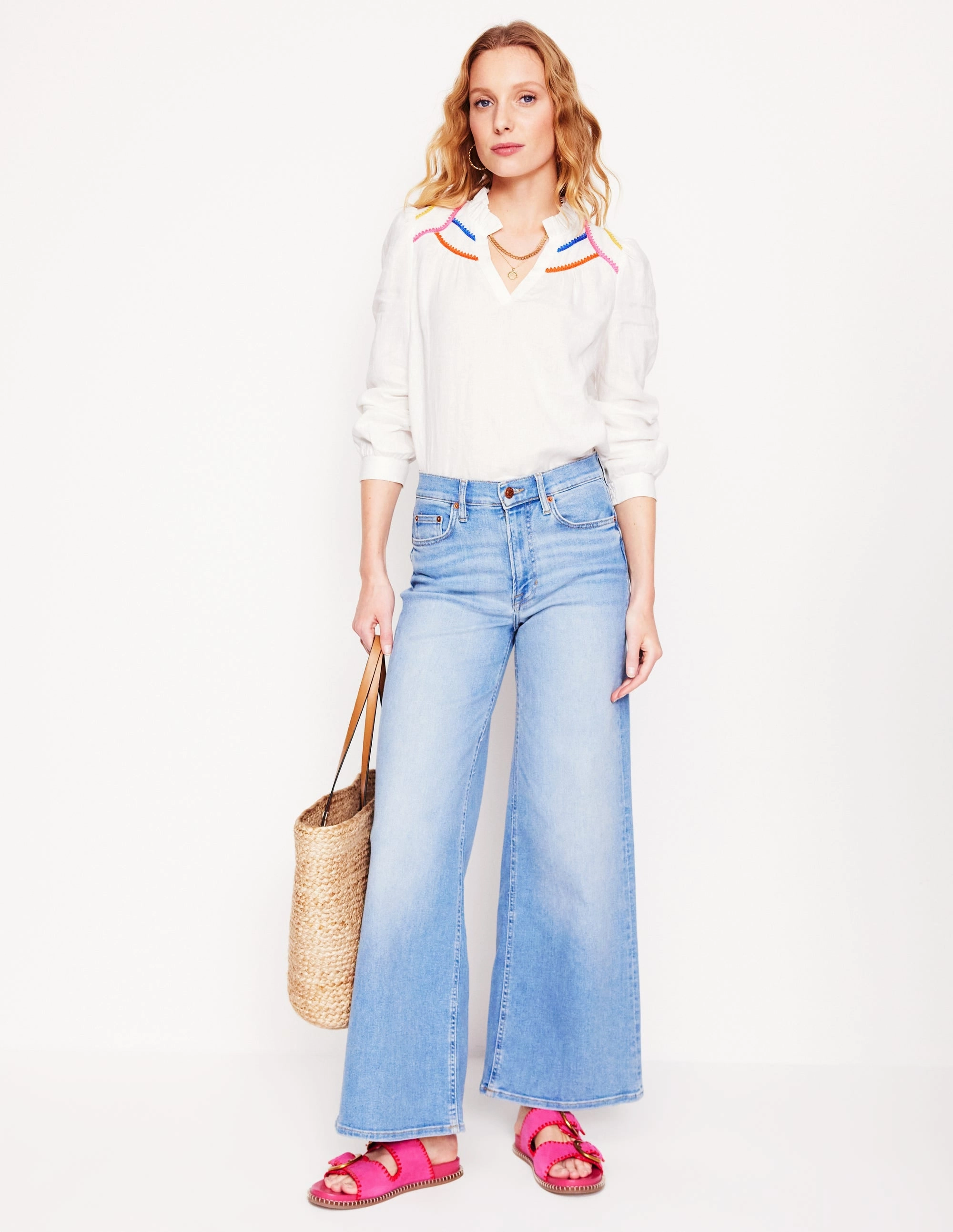 The simplicity of our Grace linen top is offset by its frilled neck detail. Team with wide-leg trousers, or denim shorts if the suns out.non restrictive tailoring allows full range of motion