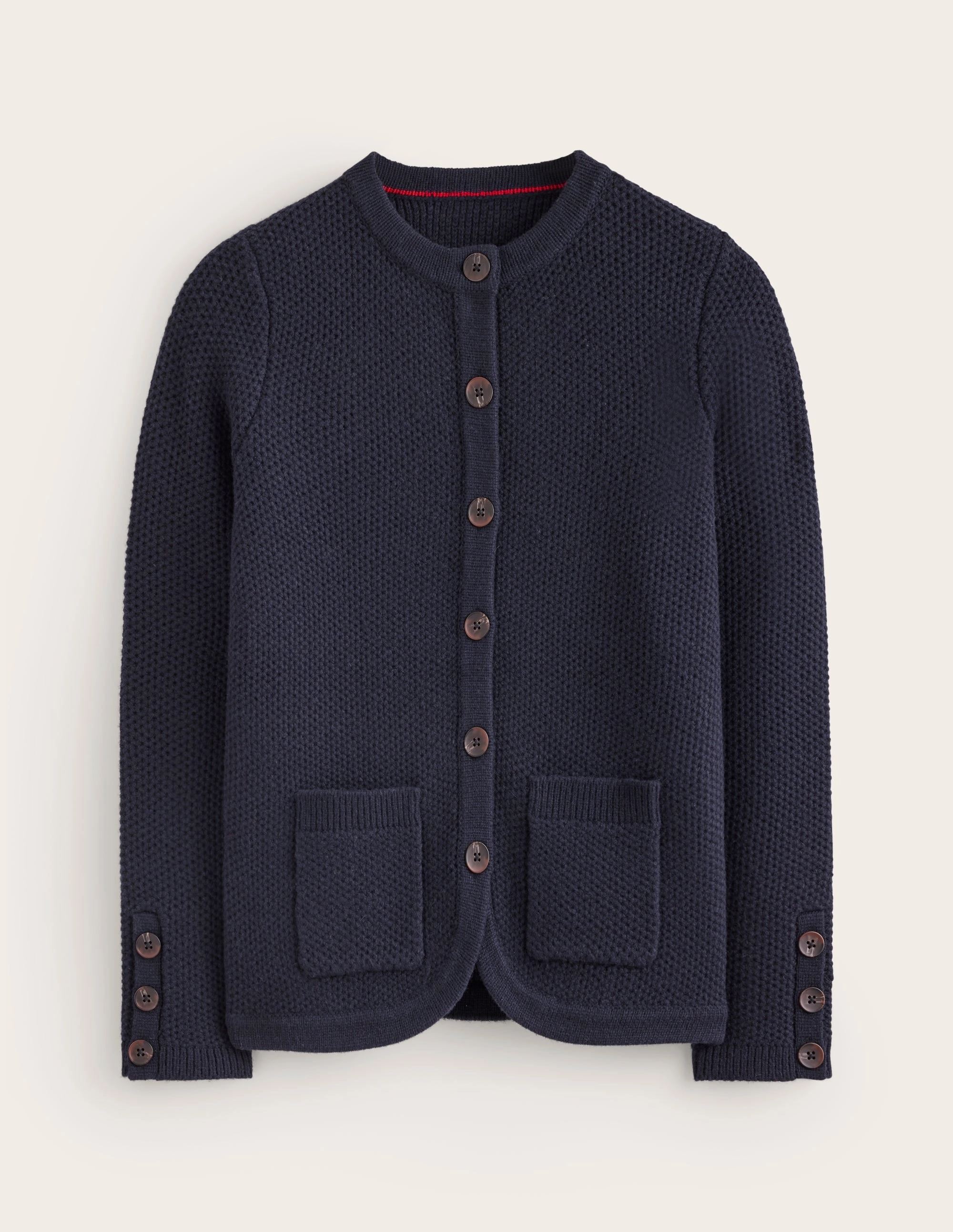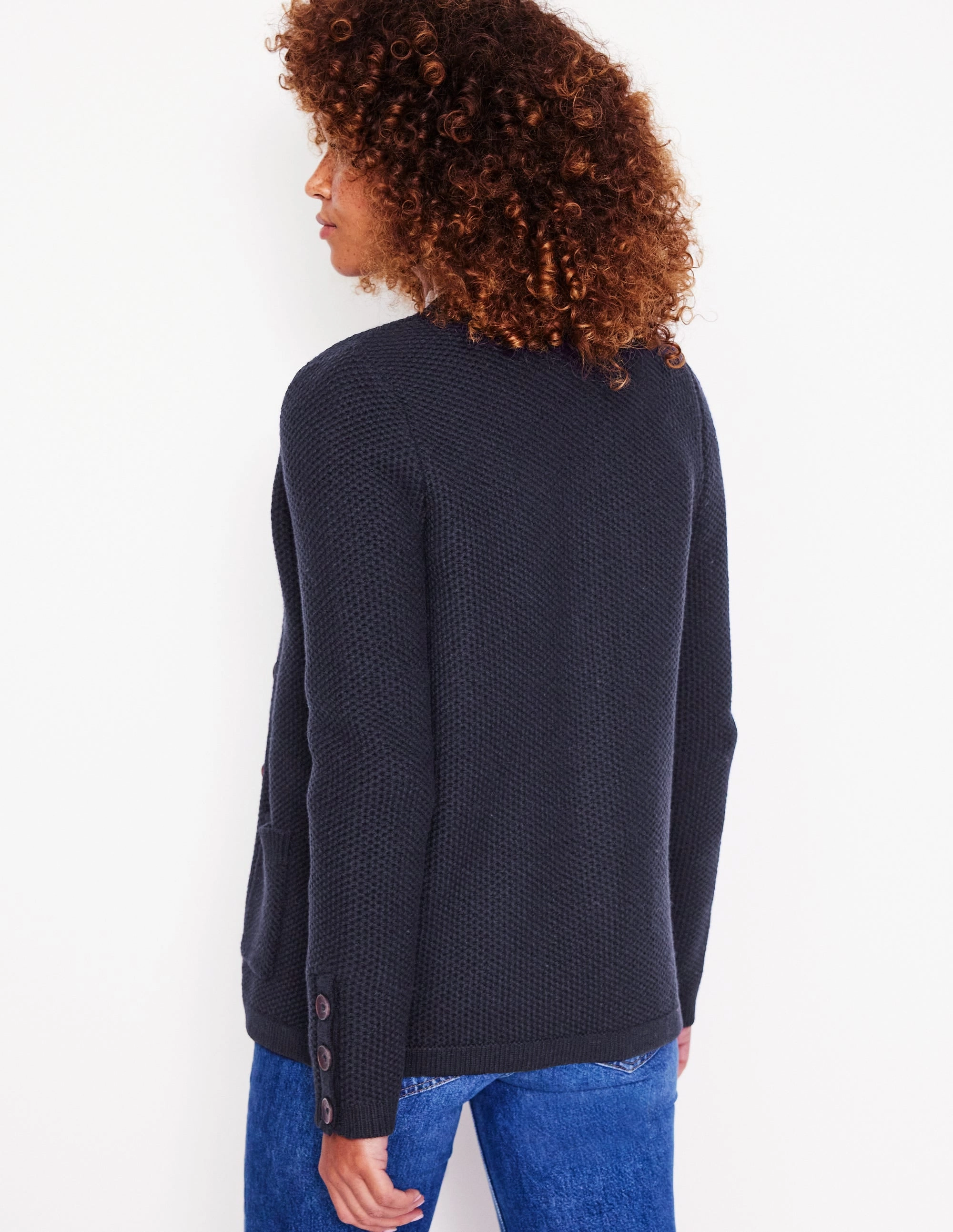 For those times when the weather app says it could be a jacket or cardi day, reach for this textured knit. The fitted style is your go-to when you need to look a little smart-ish.Nonconstricting Vneck accommodates layered necklines