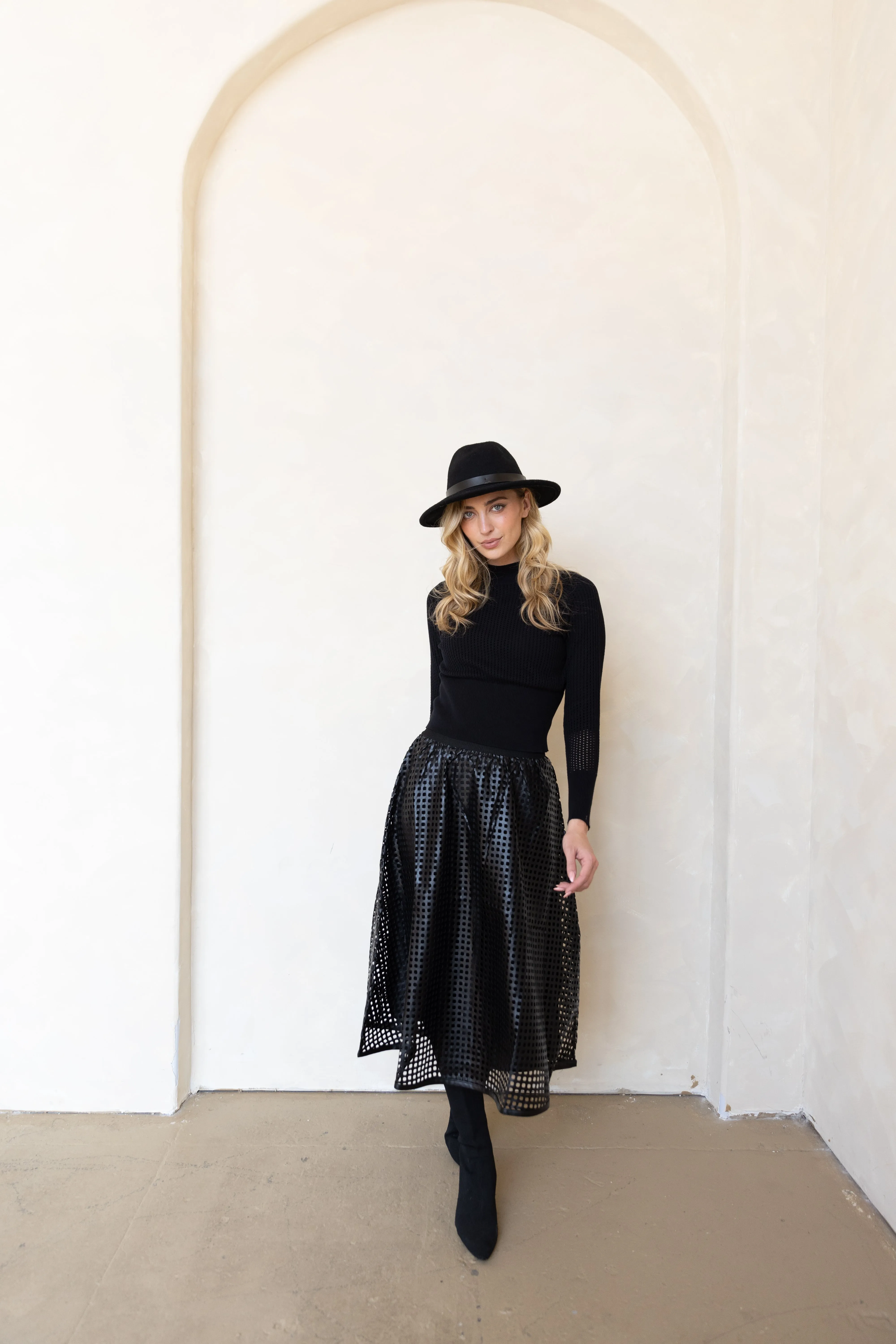 The Nessa Midi Skirt is a charming, lightweight piece available in classic hunter green and sleek black. It features an elastic waistband for a comfortable fit and a unique design with distinctive cut-out details. For a coordinated look, it pairs beautifully with the Nessa Sweater, creating a stylish and versatile set thats perfect for various occasions.