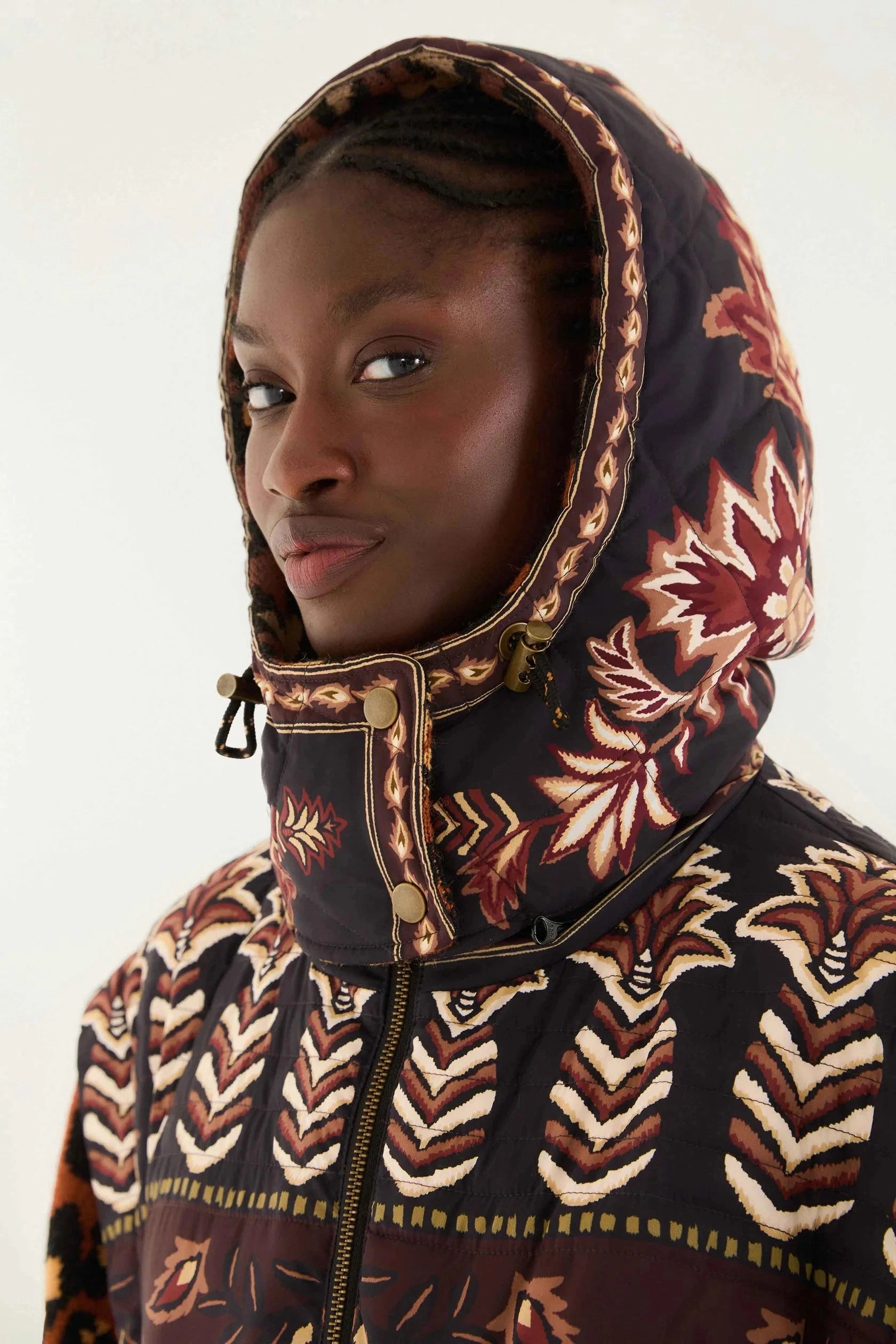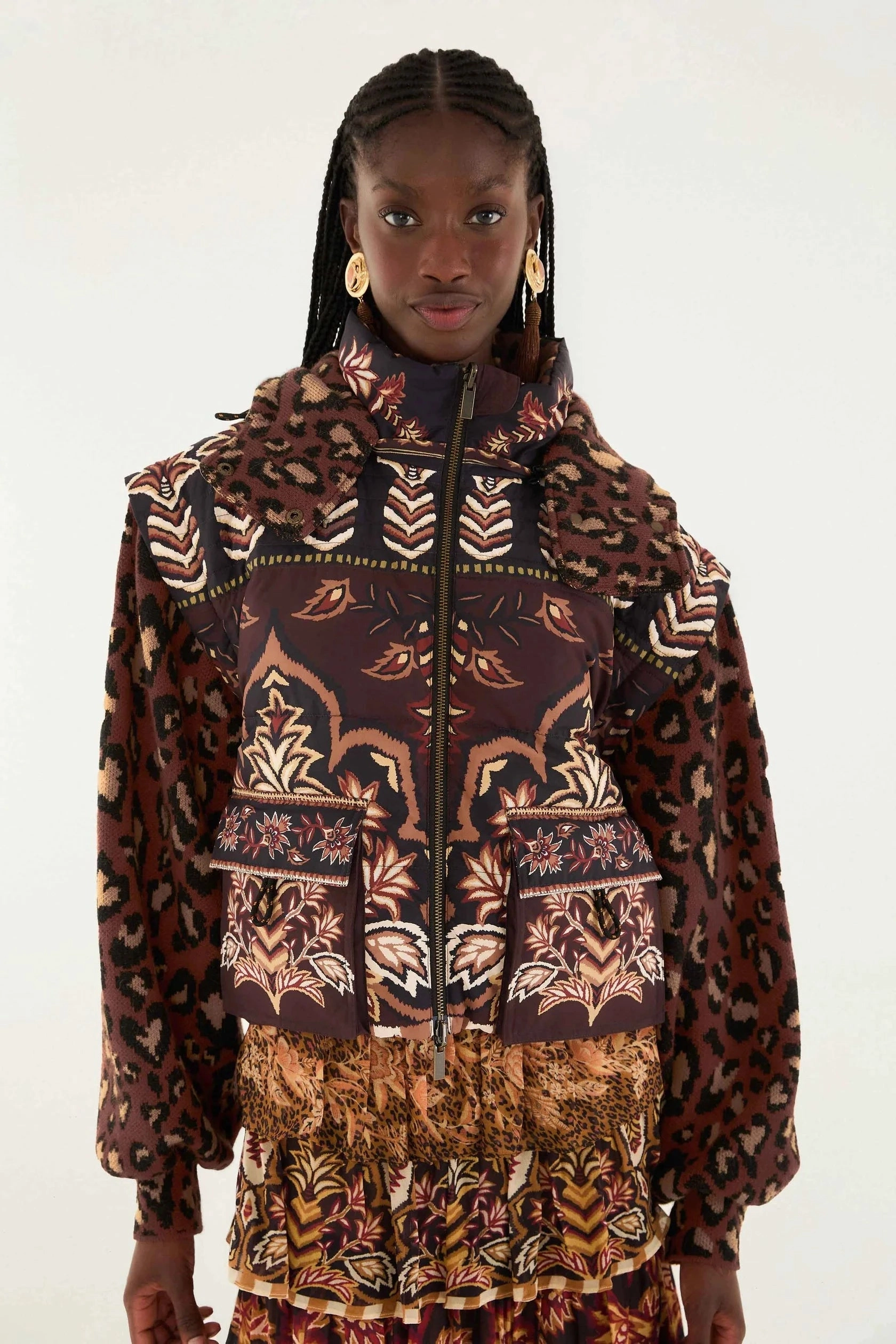 The Brown Winter Ainika Puffer Jacket invites cosy comfort with its rich brown hues and playful fusion of ornate floral and delicate leopard patterns. Its structured silhouette and high neckline wrap softly around you, while the detachable hood adds versatility. The harmonious contrast of plush animal print sleeves against the quilted, patterned bodice radiates warmth and approachable elegance, making this outerwear a joyful statement on chilly days.